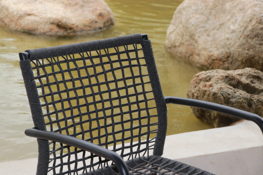 เชือก outdoor รุ่นใหม่มีคุณสมบัติทนแดด ไม่ซีดง่าย แห้งไว ไม่อมน้ำ และยืดหยุ่นนั่งสบาย งานถักหรือสานเชือกยังช่วยให้ดีไซน์ดูโปร่ง ระบายอากาศได้ดี เหมาะกับอากาศร้อนชื้น